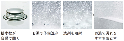 浴槽洗浄は入浴後にフロフタを閉じた状態でスイッチを押すと、自動で排水栓が開き排水を開始。お湯で予備洗浄した後、洗剤タンクから洗剤を噴射し、隅々までしっかり洗浄してくれます。汚れに合わせて洗浄コースも選択可能です。