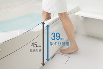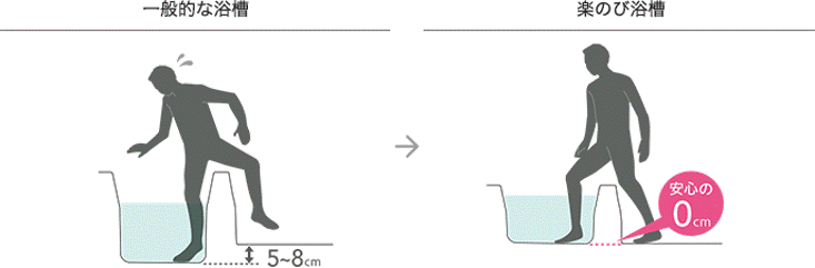 浴槽底面と洗い場床との段差をなくしました。足を自然に下ろしやすく姿勢が安定するので、より安心です。段差がなく滑りにくい床、手すりの設置などがあれば、お年寄りでも安心して一人で入浴することができます。